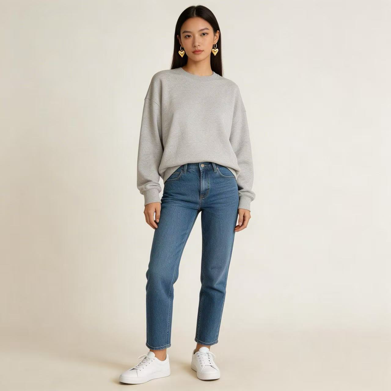 The sophisticated code of a hoodie, jeans, and heart-shaped earrings